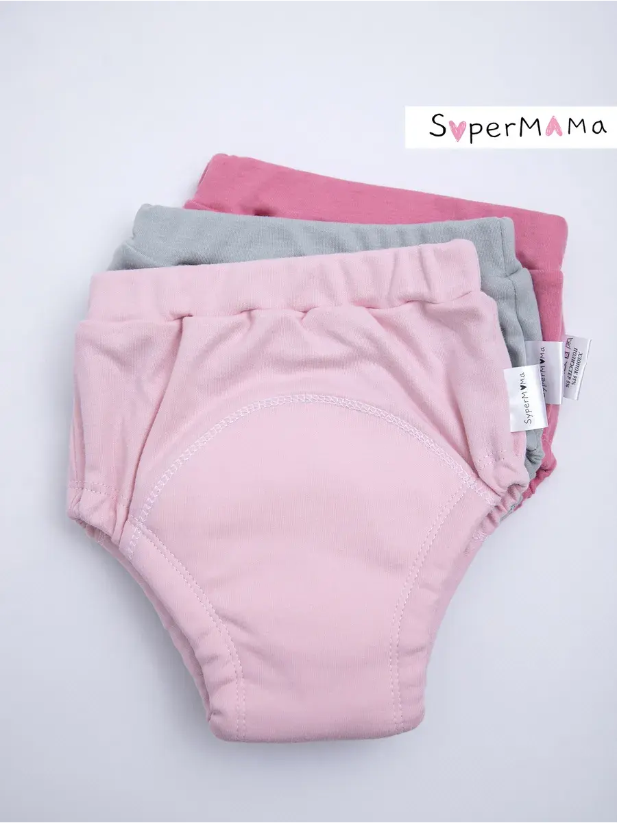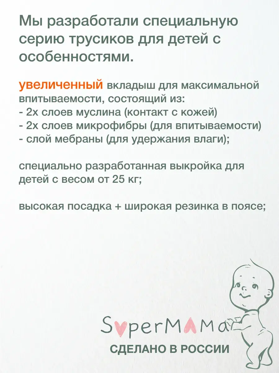 Многоразовые впитывающие трусы для детей с особенностями здоровья, специально разработаны и протестированы совместно с мамами. Трусики предназначены для деток, которые испытывают сложности с контролем естественных потребностей, страдают энурезом, недержанием мочи. Это удобное и практичное решение в период, когда ребенку необходим отдых от одноразовых подгузников. Хлопковые многослойные слипы обеспечивают защиту от протеканий и запаха, в отличии от обычного белья. Впитывающие детские трусики для мальчиков и девочек подходят для повседневного использования, а так же в ночное время для сна с дополнительной непромокаемой пеленкой. Специально разработанное подростковое нижнее белье для удобства и комфорта не ограничивает движения и не вызывает дискомфорт у детей. Набор состоит из 3-х впитывающих трусов в красивых цветах для девочки. Так же данная модель может использоваться как обычные трусики, внешне они смотрятся как привычное нижнее бельё для подростка.