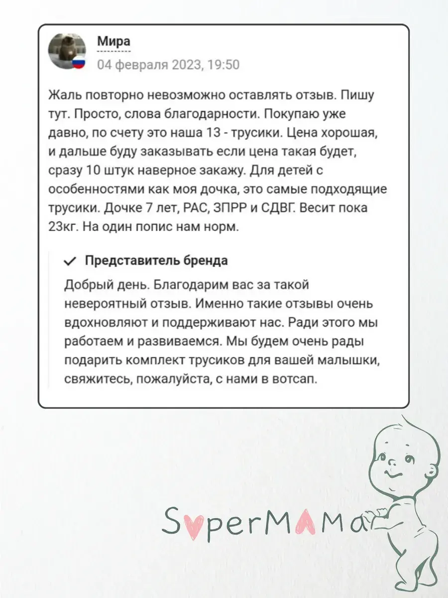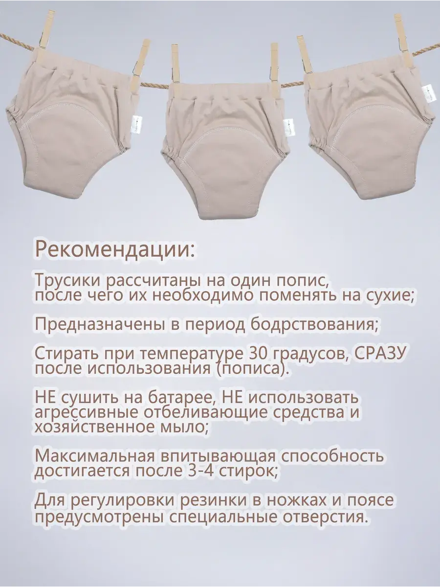 Многоразовые впитывающие трусы для детей с особенностями здоровья, специально разработаны и протестированы совместно с мамами. Трусики предназначены для деток, которые испытывают сложности с контролем естественных потребностей, страдают энурезом, недержанием мочи. Это удобное и практичное решение в период, когда ребенку необходим отдых от одноразовых подгузников. Хлопковые многослойные слипы обеспечивают защиту от протеканий и запаха, в отличии от обычного белья. Впитывающие детские трусики для мальчиков и девочек подходят для повседневного использования, а так же в ночное время для сна с дополнительной непромокаемой пеленкой. Специально разработанное подростковое нижнее белье для удобства и комфорта не ограничивает движения и не вызывает дискомфорт у детей. Набор состоит из 3-х впитывающих трусов в нейтральном бежевом цвете. Так же данная модель может использоваться как обычные трусики, внешне они смотрятся как привычное нижнее бельё для подростка.